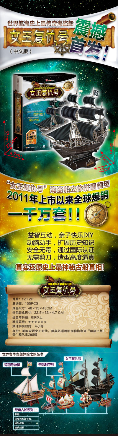 立體拼圖書是一種集娛樂、學習、欣賞于一體的DIY益智玩具書,屬于紙模型;主要材料為銅版紙和EPS泡沫板,無毒無害,拼裝的實物造型高度逼真,生動形象;可以鍛煉小朋友們動手動腦的能力,同時也可讓上班一族在工作之余放松心情舒緩壓力,在拼插動手間體驗無限樂趣。《世界奢華古船探險之旅(女王復仇號)》將1718年擱淺的古戰船';安妮女王復仇號';逼真地呈現出來,用你的雙手,再現經典而神秘的古戰船,并結合歷史知識歷史故事,演義一段航海、探險、發現的旅程。