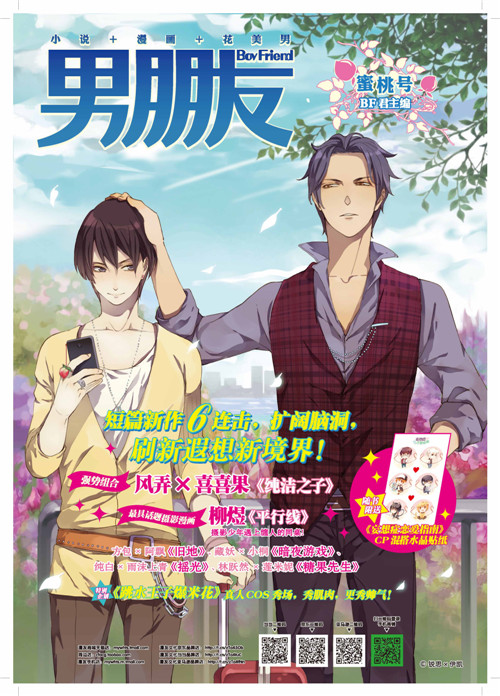 由風弄、黑色禁藥、朱小蠻、白丁、ZQQ虹等聯合打造的《男朋友》蜜桃號,除了有《音皇》、《象牙小塔》系列、《貓先生的蛋糕坊》等人氣連載外,還帶來了由風弄、喜喜果強勢聯手、充滿誘惑及抉擇的吸血鬼小說《純潔之子》等六篇不同類型、充滿遐想的短篇作品,隨書還附贈人氣漫畫《妄想癥戀愛指南》cp混搭水晶貼紙!